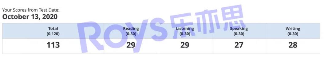 Roys樂亦思托福課程學(xué)員實(shí)現(xiàn)105到113的跨越