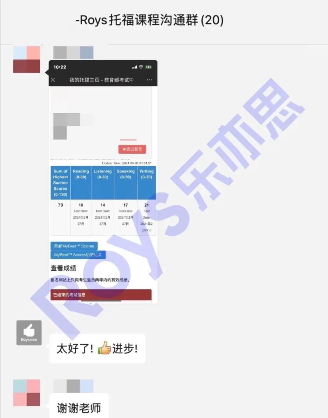 Roys樂亦思托福課程學員實現(xiàn)53到70的跨越,勤學和強化班學員進步巨大