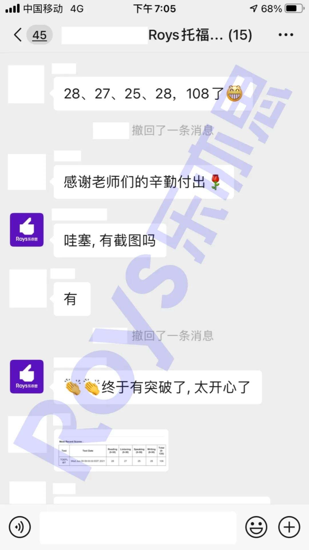Roys樂亦思托福課程學(xué)員培訓(xùn)6天從105進(jìn)步到109