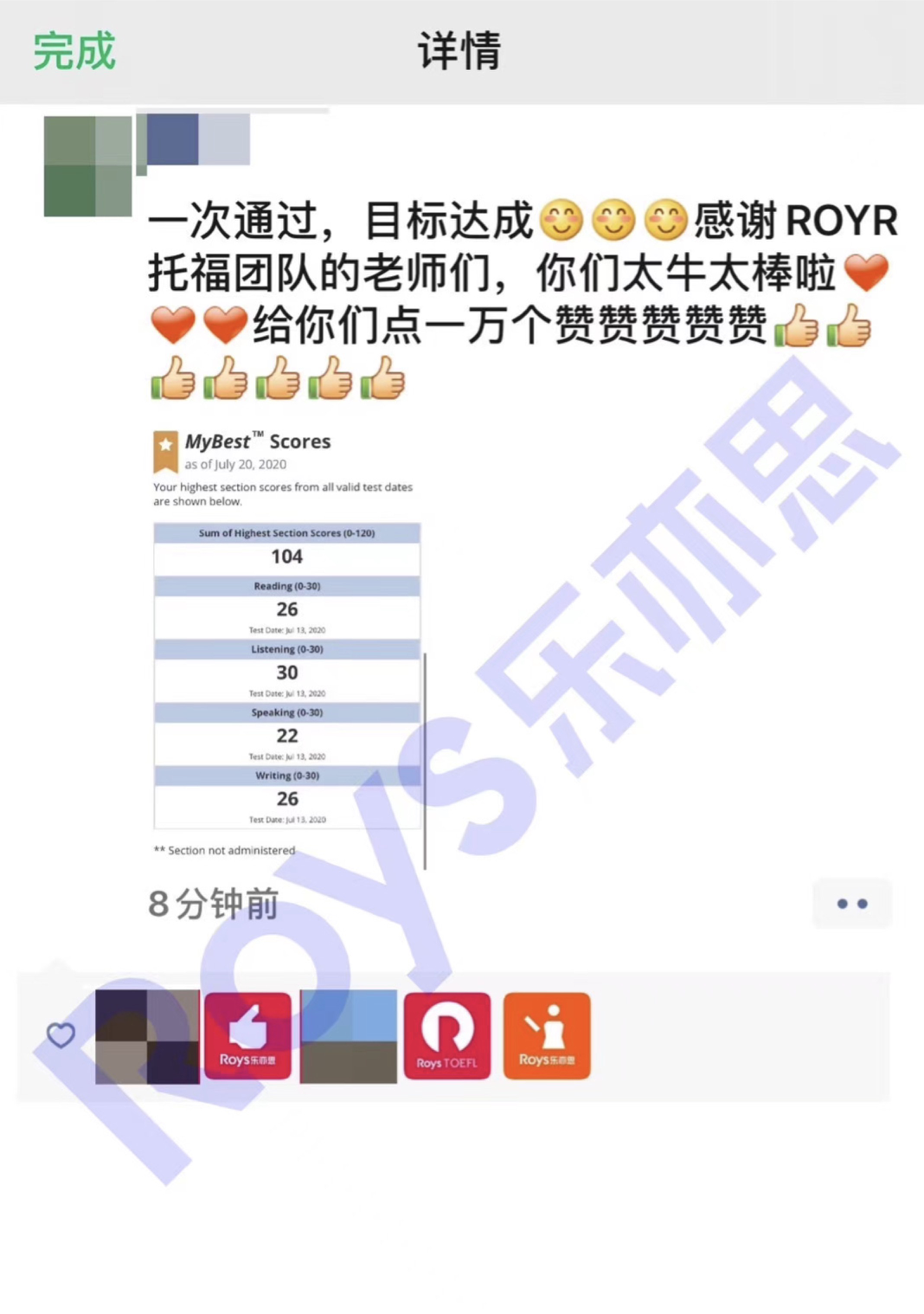 沈同學(xué)參加樂(lè)亦思托福融合班課+一對(duì)一專項(xiàng)提升,單次提分23分,取得104的好分?jǐn)?shù),目標(biāo)達(dá)成