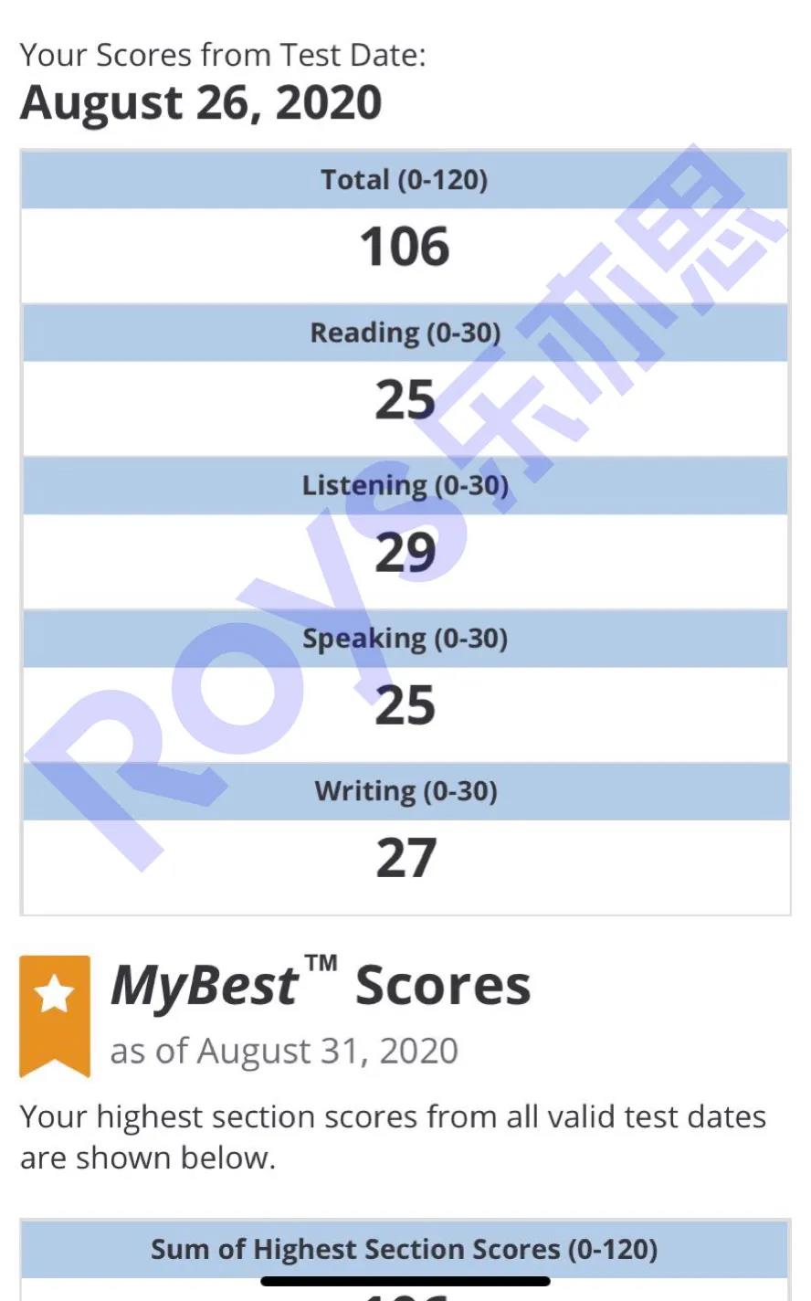 R同學(xué)經(jīng)過(guò)Roys樂(lè)亦思短期的集訓(xùn)突破瓶頸 ,總分取得106的好成績(jī)