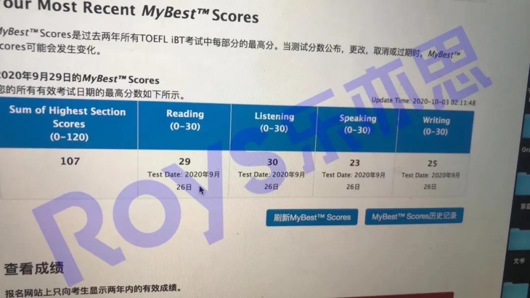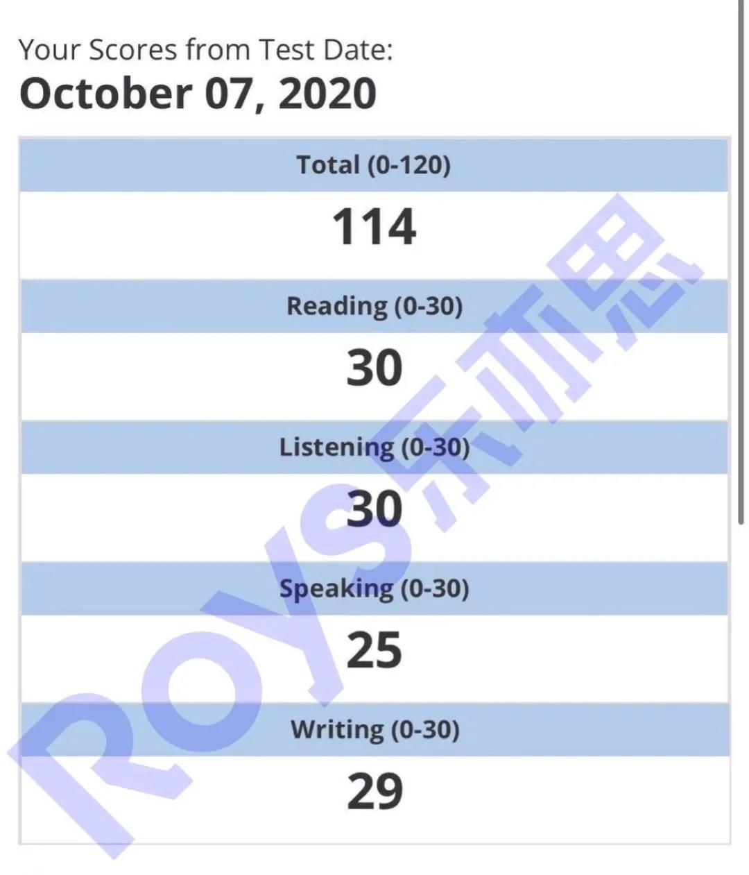 Roys樂亦思托福課程學(xué)員培訓(xùn)8天進(jìn)步9分,拿到114