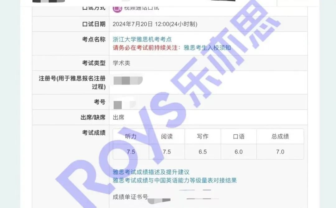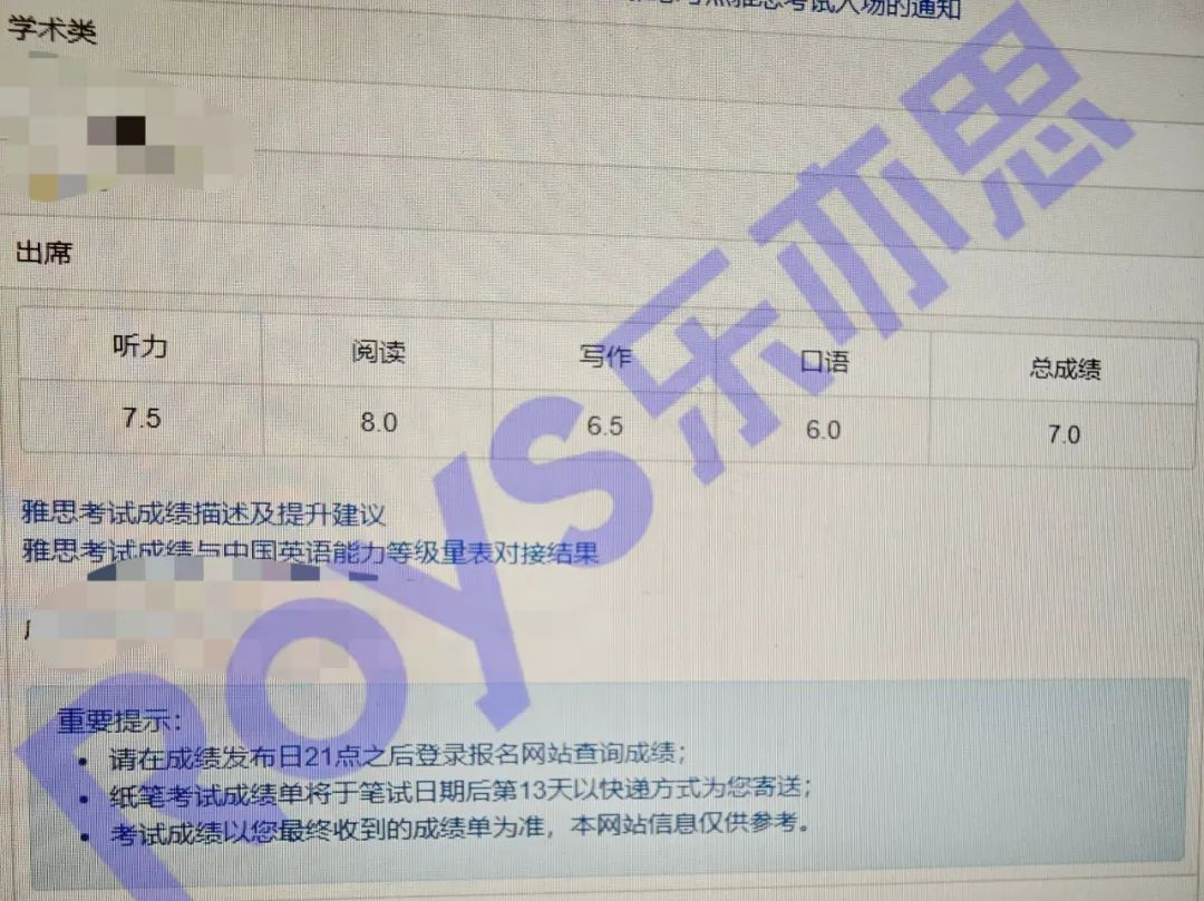 同樣如文瀾中學8年級的L同學, 在經(jīng)過雅思??寂c規(guī)劃后, 選擇樂亦思一對一定制課程.通過19天的培訓, 成功實現(xiàn)了雅思5.5→7.5分的超高分突破. 聽/閱雙雙達到7.5+的均分, 口/寫均達到了6.5+!從5.5到7.5的突破讓任課老師都驚嘆不已。