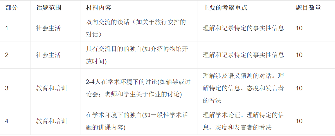 聽力總共有4大題,40小題,雅思聽力題型包括配對,真假,填充,多選,完成句子,標(biāo)簽,選圖表,簡答”等。其考試時長為40分鐘(10分鐘譽寫答案)。通常會放4段獨白和對話,每段聽力材料只放一次(所以要邊聽邊做),對應(yīng)10道問題,問題的排列順序和答案在聽力材料中出現(xiàn)的順序一致。