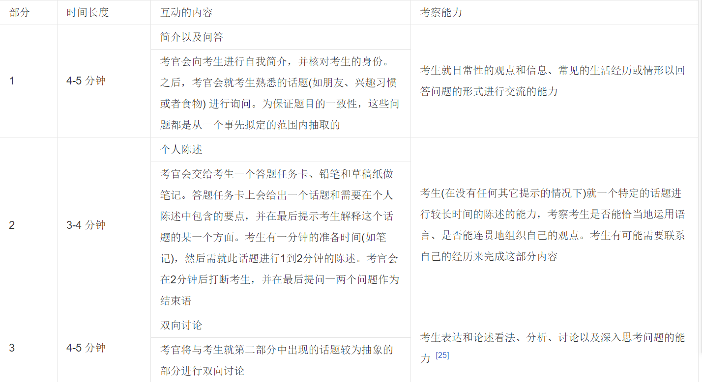 口語考試時長很短,為11-14分鐘,雅思考試口語是人考,與考官進行一對一交流的形式以考察考生的英語口語水平,是目前最接近真實生活場景的互動式測評。