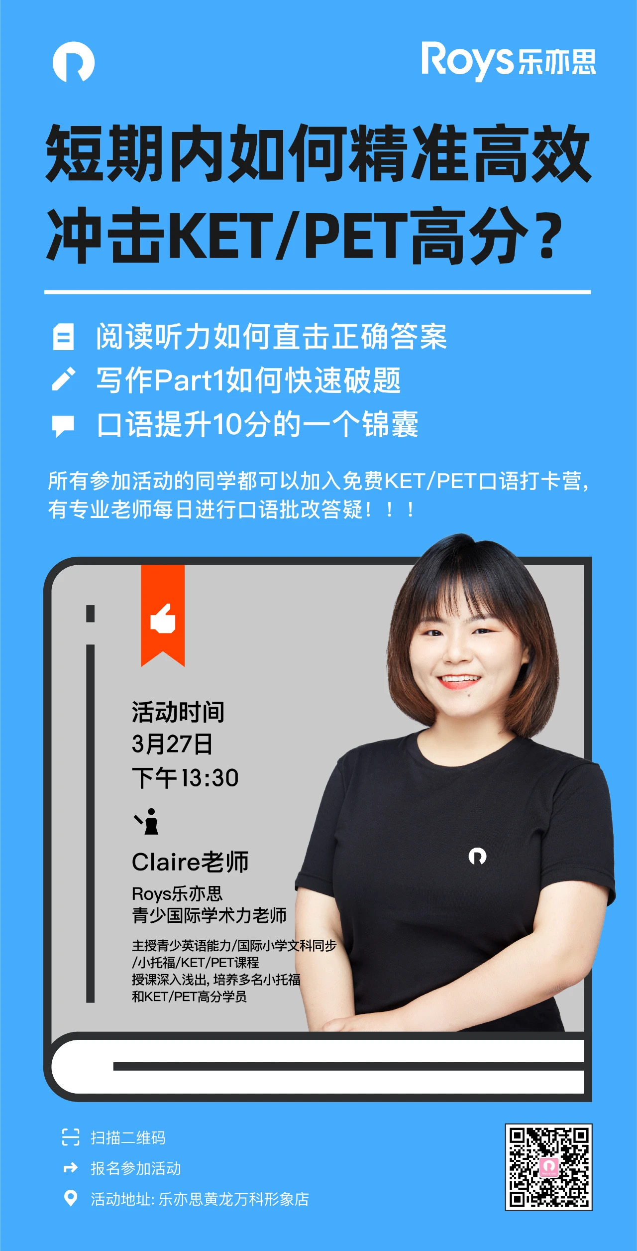 學(xué)習(xí)KET/PET的孩子們,在英語(yǔ)能力提升的效果上都很明顯,還能激發(fā)孩子對(duì)英語(yǔ)學(xué)習(xí)的熱情和好勝心。樂(lè)亦思老師多年和家長(zhǎng)孩子的接觸下來(lái),非常理解每個(gè)家長(zhǎng)對(duì)孩子的殷切期望,為了幫助孩子們科學(xué)高效備考,少走彎路不踩雷!KET/PET是什么?Roys樂(lè)亦思將于本周六3月27日下午13:30,舉辦KET和PET考試專場(chǎng)講座。