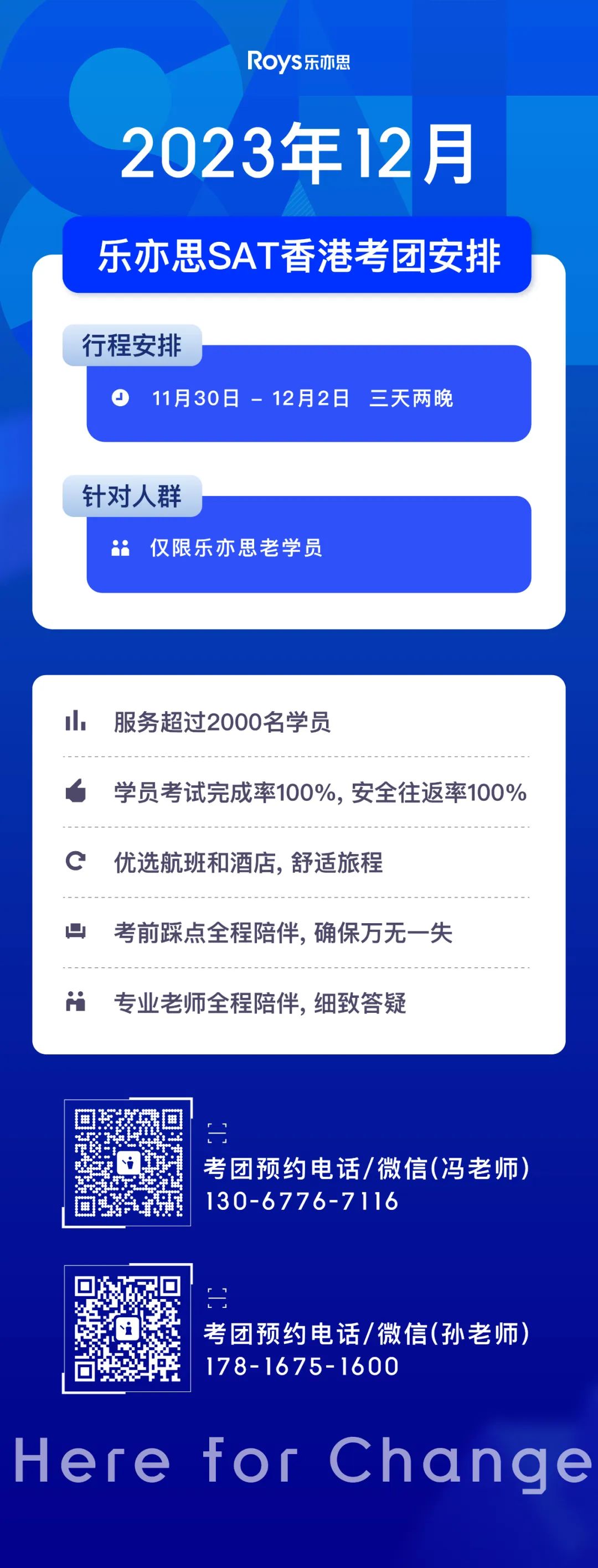 為了給樂亦思的老學(xué)員提供更全面的服務(wù), 打消家長們在考試行程和安全方面的擔(dān)憂和顧慮, 今年最后一場SAT考試, 樂亦思也將會組織12月香港SAT考試送考團(tuán)。