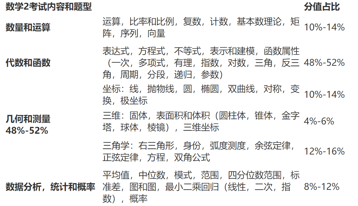 ②SAT2數(shù)學的Level 2考試內(nèi)容如下: