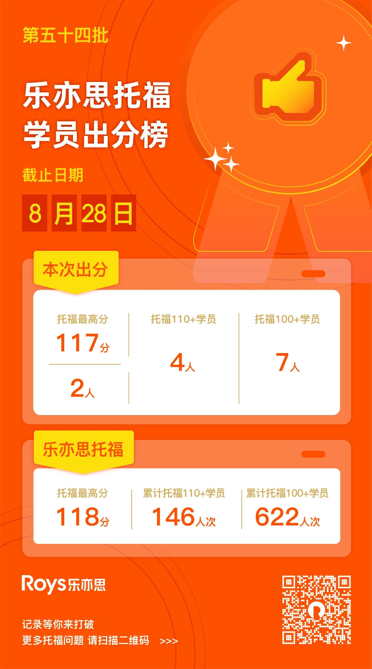 我們很開心,越來(lái)越多樂(lè)亦思托福學(xué)員考到滿意的分?jǐn)?shù),突破110+。截止8月28日,本次出分中,我們有4位同學(xué)取得110+的成績(jī),7位100+的成績(jī),累計(jì)110+的學(xué)員已146位,累計(jì)100+的學(xué)員已有622人!Roys樂(lè)亦思托福的優(yōu)秀不僅體現(xiàn)在人數(shù)上,更加可以用比例來(lái)展示,讓大家更加直觀的感受樂(lè)亦思的托福教學(xué)實(shí)力。想了解更多,可以聯(lián)系我們Roys樂(lè)亦思客服老師,給您更詳細(xì)的介紹哦。