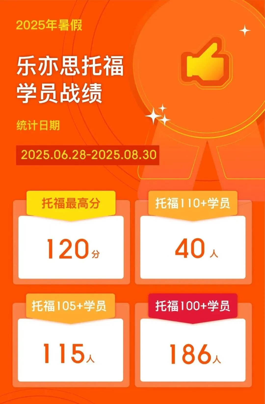 這個(gè)暑假,樂(lè)亦思托福的高分陣營(yíng)實(shí)現(xiàn)了“質(zhì)”的飛躍!短短兩個(gè)月內(nèi),竟有186位學(xué)員斬獲托福100+的超高分,其中40位更是沖上了托福110+的巔峰,最高分直逼120分!