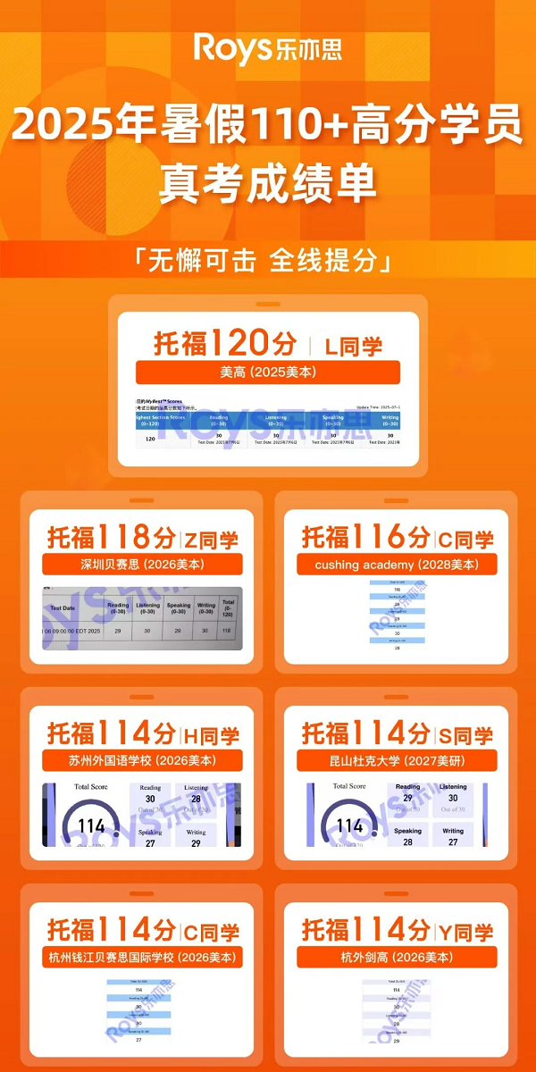同學(xué)們能穩(wěn)居110+的高地,絕非偶然。無(wú)論是要求絕對(duì)精準(zhǔn)的閱讀聽(tīng)力滿(mǎn)分,還是考驗(yàn)思維深度的口語(yǔ)25+與寫(xiě)作27+,任何一個(gè)短板都可能讓他們與高分失之交臂。正是這種無(wú)短板的全面能力,構(gòu)成了他們斬獲超高分的嚴(yán)密閉環(huán)。也正是單項(xiàng)分點(diǎn)滴積累的進(jìn)步,換來(lái)了總分的飛躍!